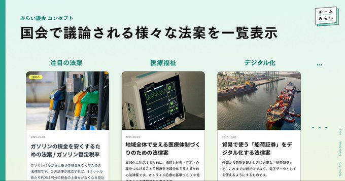 > 公約の一つ、100日プランでお約束した1議席でもできる “社会実装”として、国会でどのような議論が行われようとしているかを可視化する『みらい議会』を開発しました!