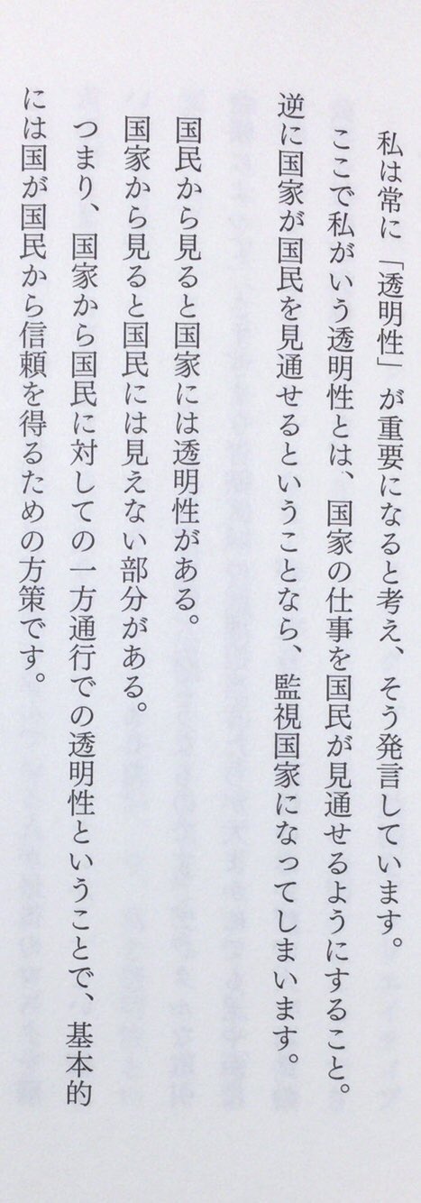 >honnoinosisi555 「私は常に「透明性」が重要になると考え、そう発言しています。ここで私がいう透明性とは、国家の仕事を国民が見通せるようにすること。逆に国家が国民を見通せるということなら、監視国家になってしまいます。」(『オードリー・タン 自由への手紙』講談社、P59)