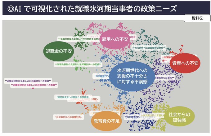 >nishio An example in which “Talk to the City” was used in the National Diet by the opposition party to question the Prime Minister. They collected the voices of the generation known as the "employment ice age" through broad listening, and created a set of questions. #plurality