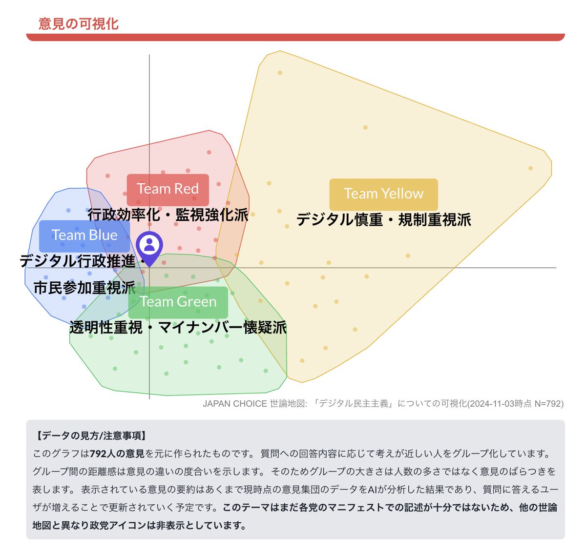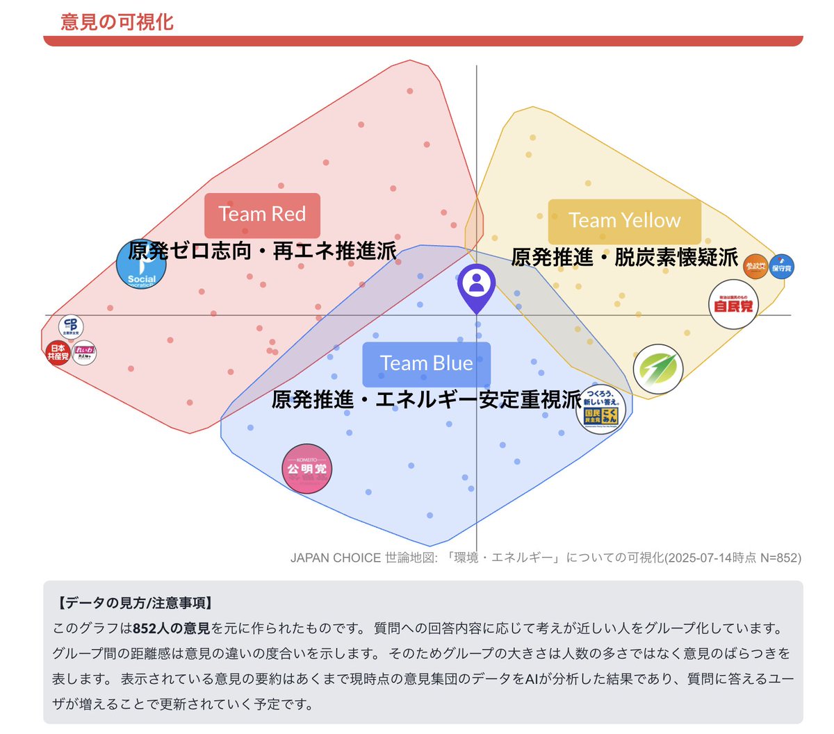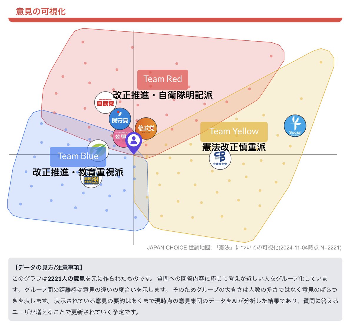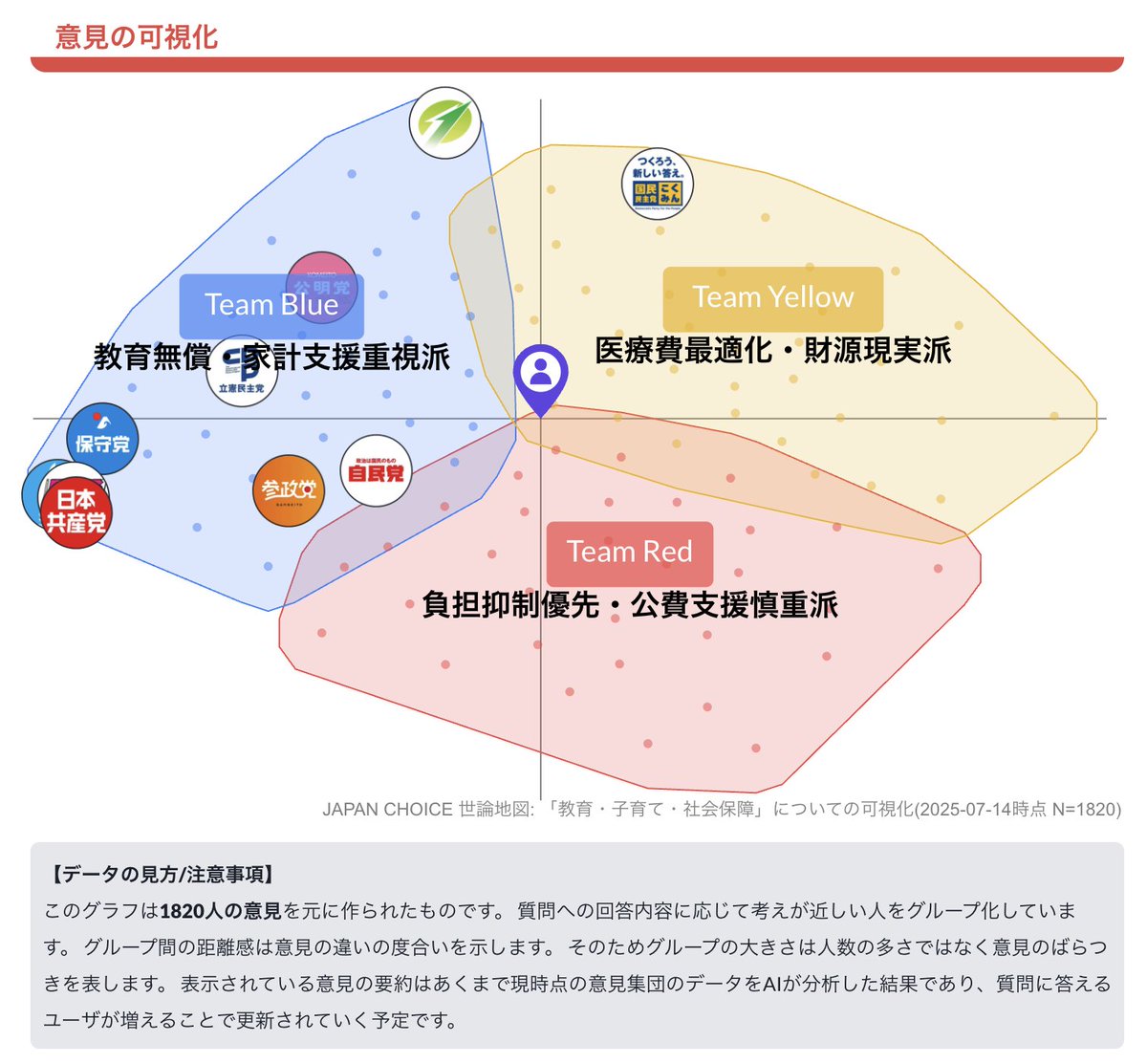 >nishio Polisが面白いと思った人は今日本で一番大規模にPolisをやっているJAPAN CHOICEの「世論地図」もみてみてください。こちらは意見グループのAI解説と政党のスタンス表示もついています。