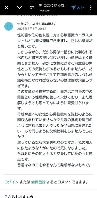 > コメント欄にわざわざ反論記事が貼ってあったから読んだら、男性目線の“まともな男性”が本当にまともかどうかは男にはわからないって話なのに、それすら男にはわからないんだなぁと思った。この話にこうやって反論する時点でまともではないんよ。