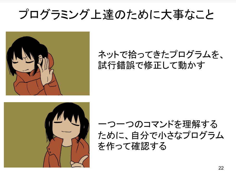 >nishio これに対して二つ目のモデルは「自分でプログラムを書き、実行してみて挙動を観察して自分の理解が正しいかを確認し、間違っているなら修正する」という試行錯誤を繰り返して一人で学ぶアプローチだ。