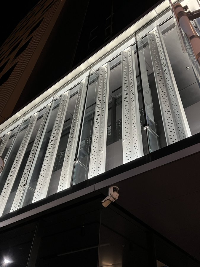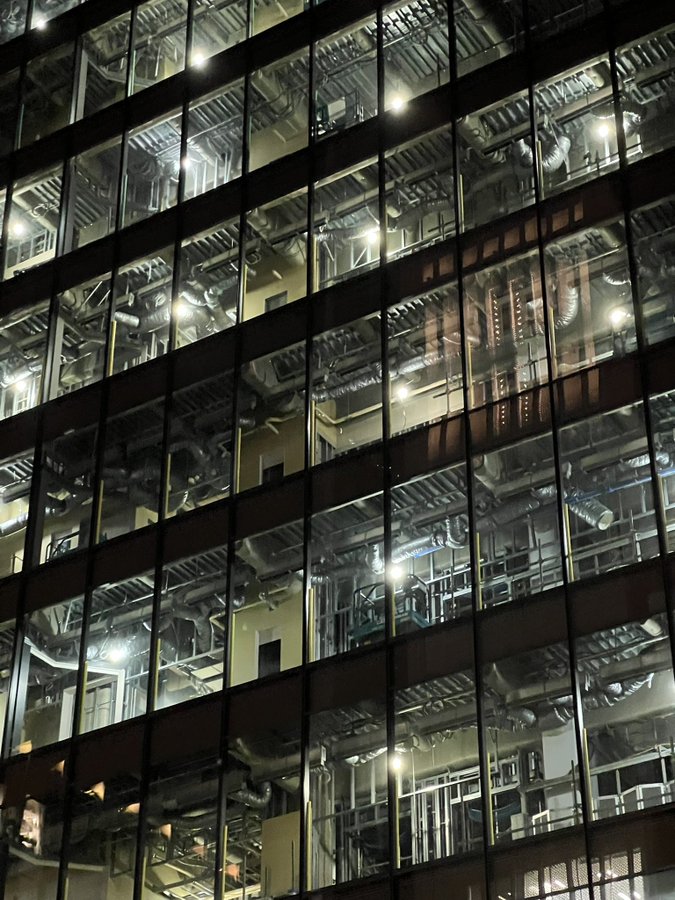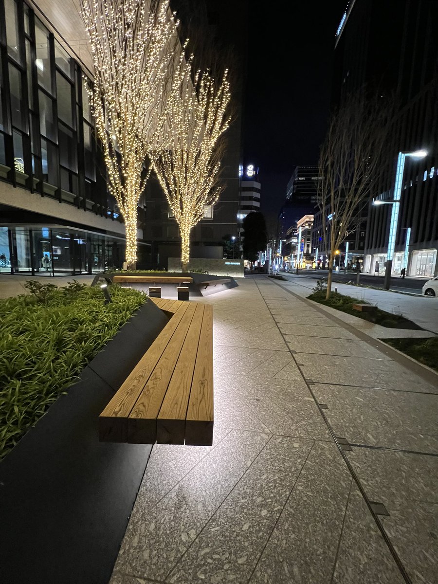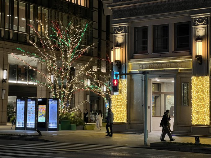 >nishio 土曜夜のオフィス街、ネオンサインとかなくて基本暗いので逆に面白いぞ