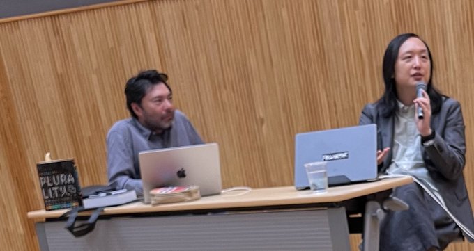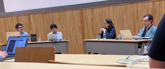 >takahiroanno plurality(プルーラリティ)著者のオードリー・タンさん、グレンワイルさん、日本語版解説の鈴木健さん、謎のyoutuberの4人の写真が撮れました!