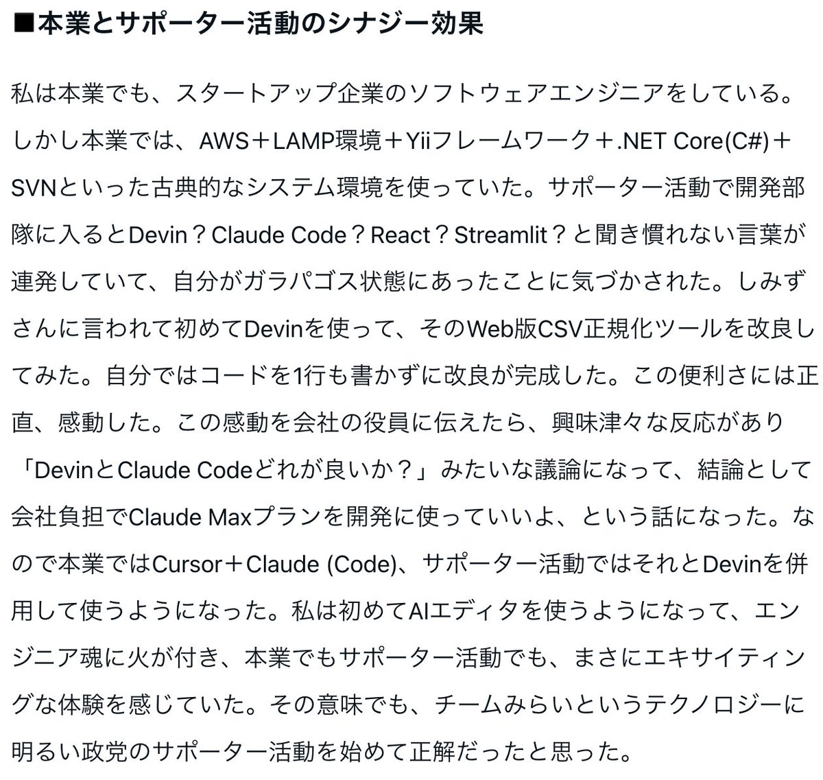 > nishio 「現場のITスキルを知らずに、自分たちが開発した最強ツールを押しつけても無用の長物と化す」って思うのはオープンソースの概念が伝わってないのだと思うけど「開発したものを対価を取らずに公開して誰でも使えるようにします」って話なので使うかどうか決めるのは各地方自治体だよ> >kagumiyabi: チームみらいの政策を見てて思うのは「行政の現場に入って一度働いて見てくれ」と思う。> 現場のITスキルを知らずに、自分たちが開発した最強ツールを押しつけても無用の長物と化すのは目に見えてる> 彼らは開発の華やかさは見えてるようだが、維持管理の地味さが見えてない気がする。かなり危ない。 x.com/kabukabubaby/s…> nishio 普通はソフトウェア開発に対して費用が請求されるものを、全部公開して無償提供しちゃうよという話。普通はそれをやると開発者が食べていけないわけなのだが、1議席獲得して政党になればエンジニア10人が「売り上げを立てなくても食べていける状態」になるからやるよ!という政策なわけ> nishio 発想が斬新で、本当に頭いいアイデアだなーと思うんだが、斬新すぎるので噛み砕いて説明しないとわかってもらいにくいんだろうな。一見非常識とか非現実的に聞こえるんだろう。> 「自分たちが実現に責任もてることしかマニフェストに書かない」って主張してるわけなので、書いてることは実現可能なこと> nishio 普通はお金を払って作ってもらうわけなので「お金払って作ったから使わないわけにはいかない」となって強制力が働くんだけど、オープンソースなら無料だから使いたいかどうかで決まるわけ。3月にリリースした「広聴AI」がもう複数の自治体で使われてる実績があるわけなんで、それと同じことなのよ