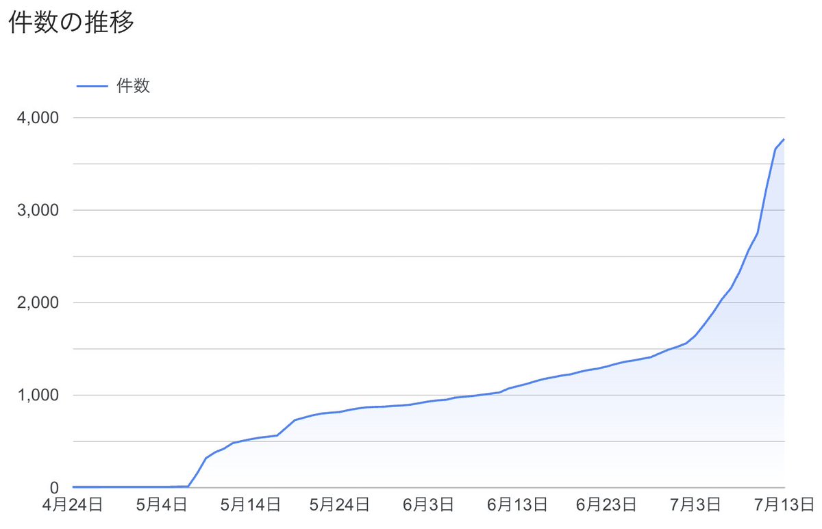 >nishio 個人的にいい指標なのではないかと思っているのが「寄付をした人数」で、これは公示日以降どんどん加速して指数関数的成長をしているのがいい感じだなと思っている。