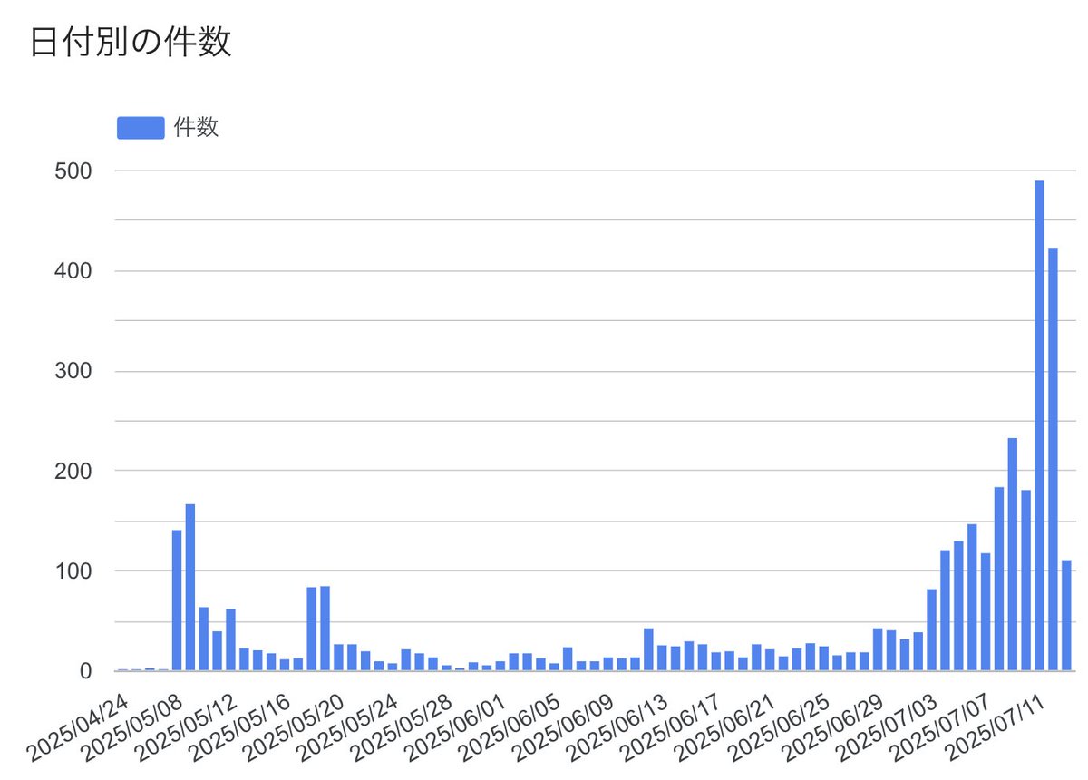 >nishio ほんと各種指標が軒並み指数関数的成長の様相を示してて、ただ初めての出馬なので「どの指標がどれくらいだったら票がいくらになるのか」の係数がわからなくて確定的なこと言えないんだよね。現時点でも政党になる確率がまあまああって、ここから1週間でかなり伸びそう、という気持ち。