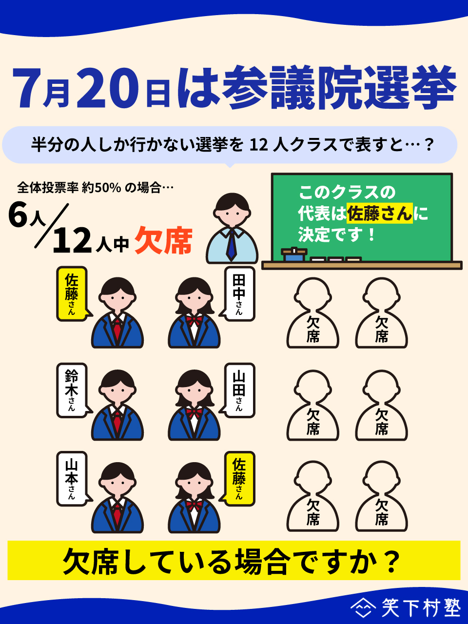 >nanatakamatsu 前回の参院選では無投票が47.95%と約5割でした。これは12人中6人欠席のクラスのようなもので、クラスの仕組みが、残りの6人によって決められてしまうようなものです。欠席しているうちに、自分たちに不利なルールが決められているかもしれません。さて、みなさんは欠席している場合でしょうか。