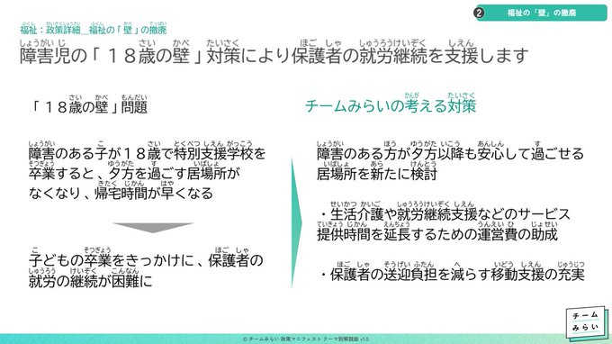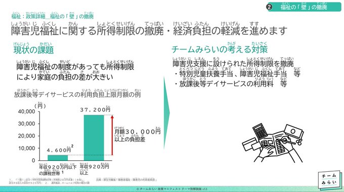 > ・障害福祉に関する所得制限の撤廃や、「18歳の壁」「親なき後」への対応課題