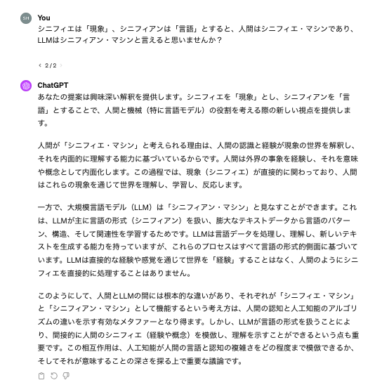 この見方に従えば、LLMは膨大な言語データ(シニフィエ)から知識 (電荷)を抽出し、ユーザーとのインタラクションを通じてシニフィエを動的に生成する、言語の「電磁場」のようなものと言えるかもしれません。