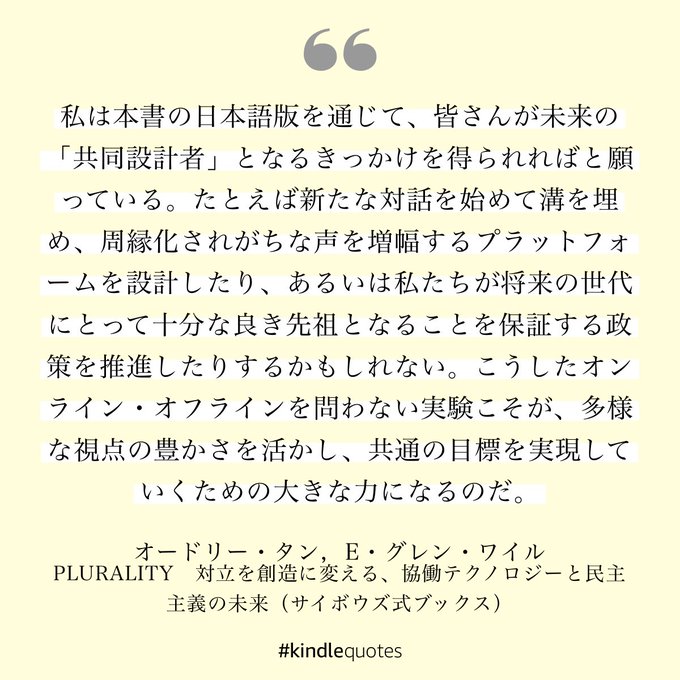 > plurality_book 『PLURALITY 対立を創造に変える、協働テクノロジーと民主主義の未来』はCC0パブリックドメインのオープンソースです> 多くの方がこのプロジェクトの協力者となり、未来の共同設計者となってくださることを願っています>