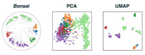 > heat_1nt 構造を用いて高次元データをほぼ歪みなく可視化・解析できる新手法 “Bonsai“> >DucheneJohan Popular methods like UMAP & t-SNE are stochastic and distort data structure. > Bonsai - a novel method - builds trees to relate high-dimensional objects, accounting for measurement noise.> UMAPやt-SNEのような一般的な手法は、確率的でデータ構造を歪めるものです。> Bonsai は新しい方法で、高次元のオブジェクトを関連付ける木を建設し、測定ノイズを考慮します。> https:// biorxiv.org/content/10.1101/2025.05.08.652944v1...> > スケーラビリティ◎、枝長で意味的距離も時系列変化も一目瞭然、構造も直感的