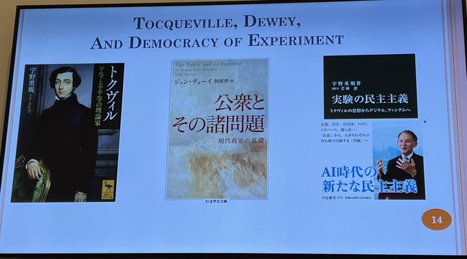 > nishio トクヴィル、デューイ、実験の民主主義、今書いてる本がハンナアーレント、多様な実験を許すのが民主主義だ(デューイ)> > nishio アジアをつなぐ思想家としてのトクヴィルとデューイとハンナアーレント