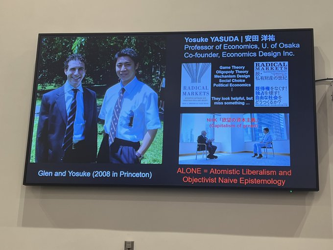 安田洋祐氏からは、経済学の視点から新しい社会システムのデザインに取り組んでいることが話され、プリンストン大学時代のグレン・ワイル氏との出会いについて、当時の写真とともに紹介されました。