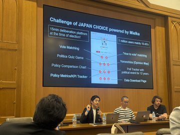 トンフィー氏:自身が開発・運営するサービス「JPAN Choice」を紹介しました。これはデータ、テクノロジー、デザインの力を用いて民主主義をエンパワー・アドバンスさせることを目指しており、特にデザインの重要性を強調し、情報弱者も含めたインクルーシブな参加を目指していると述べました。民主主義における課題として、情報のインプット(偽情報問題)、情報の咀嚼プロセス(システム1による直感的・反射的な意思決定からの脱却)、集合的意思の反映(選挙や代表制以外の形)の3つを挙げ、JPAN Choiceがこれらの改善を目指していると説明しました。JPAN Choiceはボートマッチ**、クイズによるゲーミフィケーション、政策比較(80以上のトピック)、重要KPIのトラッキング、投票方法ガイドなど多様な機能を提供し、主に10代から40代前半の100万人以上が利用していると報告しました。昨年の選挙でPolisというオープンソースソフトウェアを用いて西尾氏と共に開発した**「世論地図」を紹介し、これが単純な賛否だけでなく、意見の多様なクラスターや分断**、共通点などを可視化できることを説明しました。