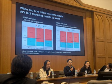 AIによる偽情報生成の現状と対策について議論されました。AIがリアルな偽情報(フェイクニュース、画像、音声)を生成できるようになり、情報源の真贋判断が難しくなっていることが課題として挙げられました。AIによる警告のタイミングが重要であるという実験結果が紹介され、動画視聴中に警告を表示することが偽情報共有意図を効果的に減少させることが示されました。