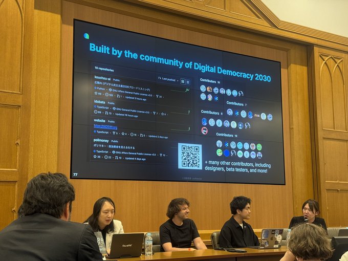 > takahiroanno 昨日、Plurality Tokyoで『AIは民主主義を進化させるか?』というトークセッションに出席させていただきました! 台湾のオードリー・タンさん、Polisのコリン・メギルさん、Bluemoさん、Oyama Akinoriさんとご一緒させていただきました!> >blu3mo Plurality Tokyo セッション5 AI は民主主義を進化させるか? > パネリスト:青山柊太朗、Colin Megill、Audrey Tang、安野貴博 / モデレーター: Akinori Oyama > デジタル民主主義2030コミュニティのプロジェクトの話など紹介させて頂きました!>