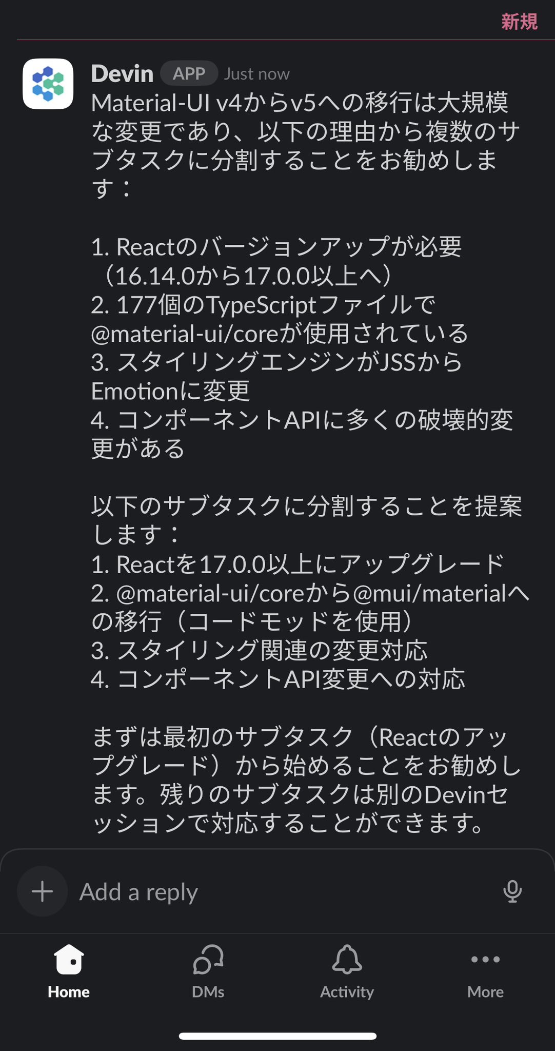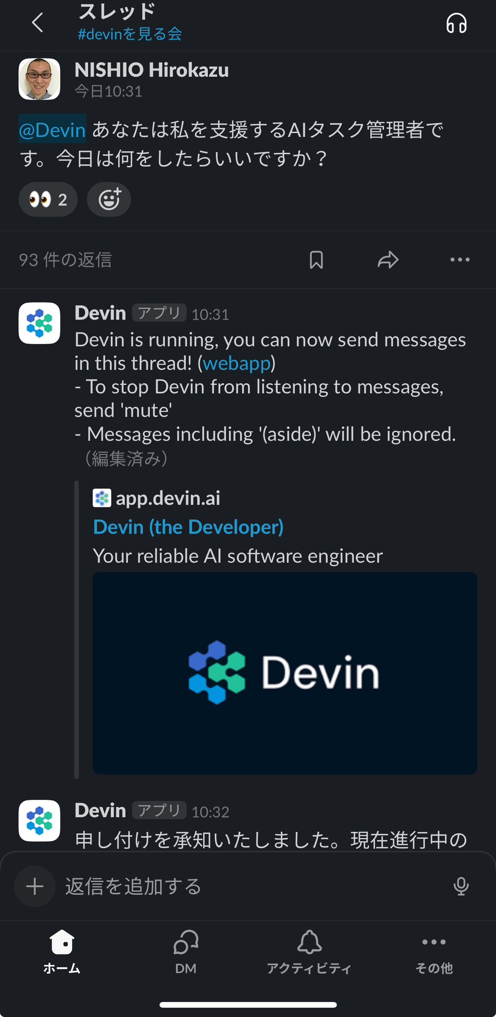 その前にまずSlackでDevinに話しかけるとどうなるのかを見る